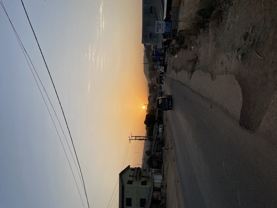 An image depicts a road leading towards the setting sun. Buildings line the road on the left. Utility poles run along the side of the road, with power lines extending across the sky. A three-wheeled vehicle is traveling on the road towards the sun. The sky is a mix of orange and pale blue. The road appears to be asphalt, with some damage and rough patches. The roadside has dirt and vegetation. A sign is visible on a building on the right side of the road.