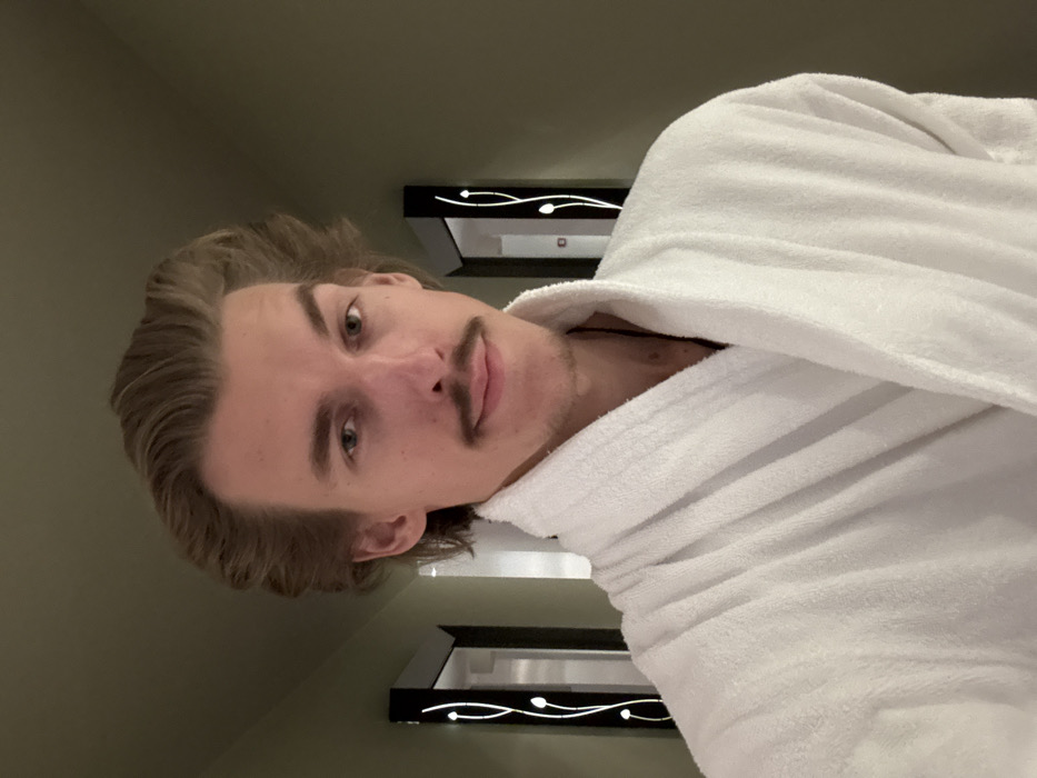 A male individual is centered in a close-up, chest-up shot within an indoor hallway, located in Polianytsia, Ukraine. The subject possesses fair skin, light brown hair styled with volume, swept back from his forehead, and light-colored eyes. He has a dark moustache above his upper lip and light stubble on his chin and cheeks. He is wearing a white, textured terrycloth bathrobe, with a dark string or necklace visible beneath the collar. His facial expression is neutral to slightly smiling, and he looks directly into the camera. The background features a plain, muted olive-green wall. On both the left and right sides of the frame, identical decorative wall fixtures are present. Each fixture is a vertical, dark-framed panel with an internal, illuminated white curvilinear design, resembling a stylized vine with two distinct circular light points. Reflections are visible within these fixtures, including a partial doorway in the left panel's reflection. The hallway recedes into the background, providing depth to the scene.