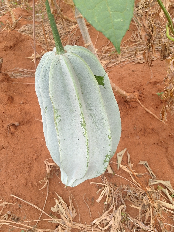 A single, elongated, pale greenish-grey, ribbed plant pod hangs from a green stem in an outdoor agricultural area within the city of Nsukka, Nigeria
