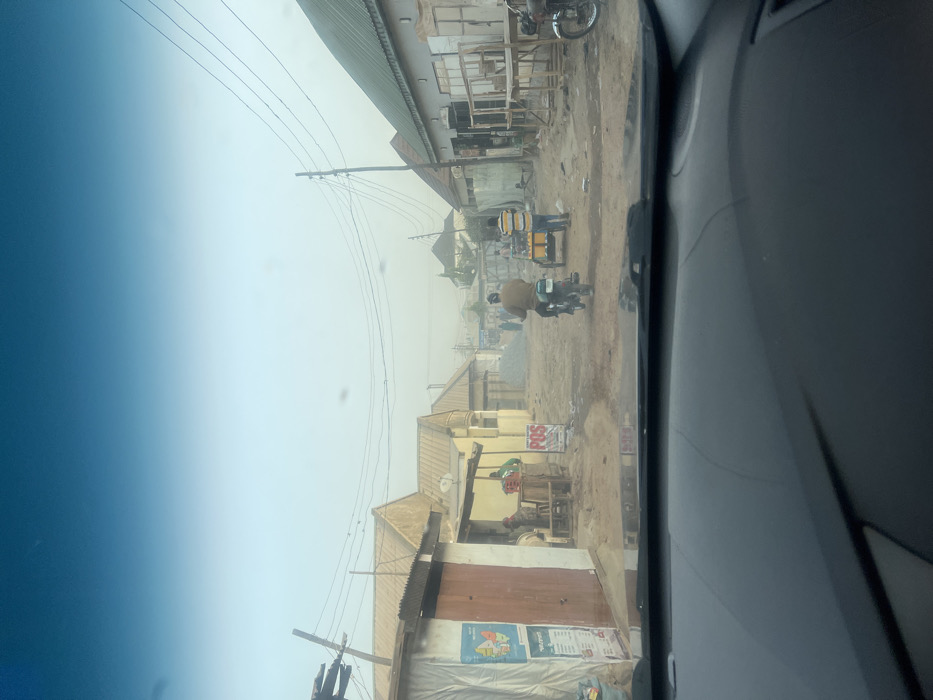 The image depicts a street scene in the city of Ado, Nigeria, viewed from inside a vehicle