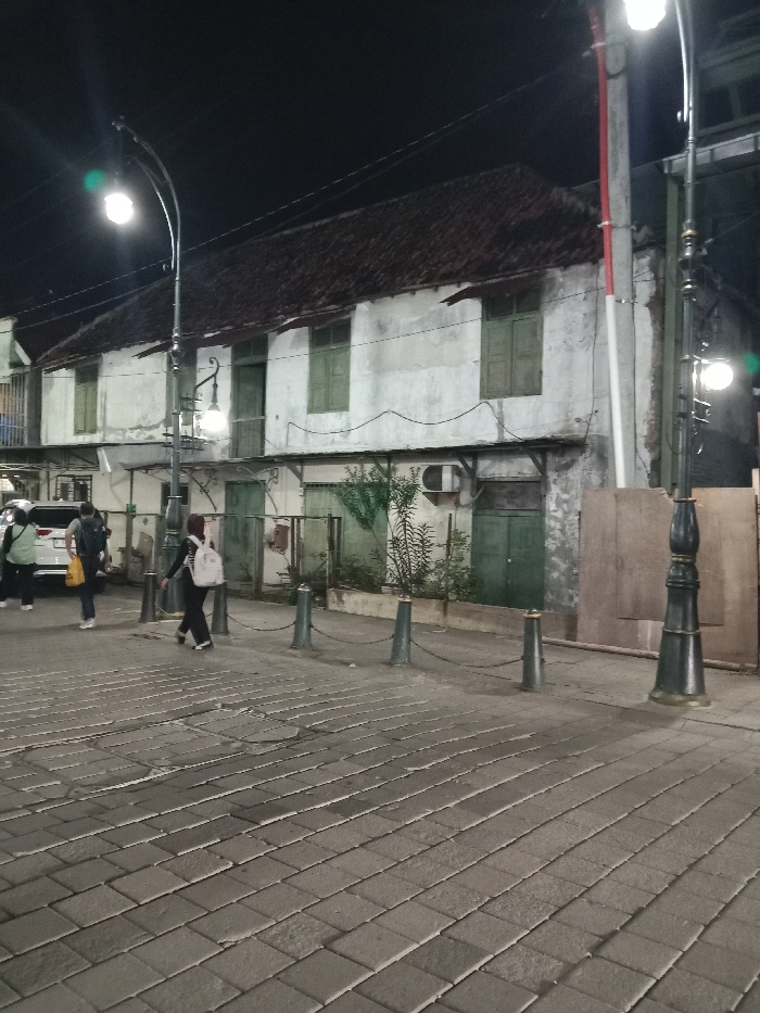 This nighttime image depicts a pedestrian area within the city of Semarang, Indonesia. The foreground consists of a paved walkway made of gray rectangular pavers, showing some signs of wear. Along the right edge of this walkway, a series of five dark-colored bollards with golden caps are interconnected by chains, forming a barrier. Two ornate streetlights with bright, spherical luminaires illuminate the scene; one is positioned centrally on the left, and another, more decorative pole, stands on the far right. In the midground, three individuals are walking from left to right. The leftmost person wears light-colored clothing and is partially obscured. Following them is a male wearing a dark shirt and pants, carrying a yellow bag over his shoulder. The third individual, a female with dark hair, wears a striped top, dark pants, and a white shoulder bag. A white SUV is partially visible in the far left background, parked or stopped. The background is dominated by a two-story building with a worn, light-colored facade and a dark, red-brown tiled roof, some sections of which appear damaged. The building features multiple closed green-shuttered windows on both floors. At ground level, various doors are visible, some also painted green, and an outdoor air conditioning unit is mounted on the wall. Sparse vegetation grows in front of the building. Utility lines are visible against the dark, clear night sky above and across the building's facade.