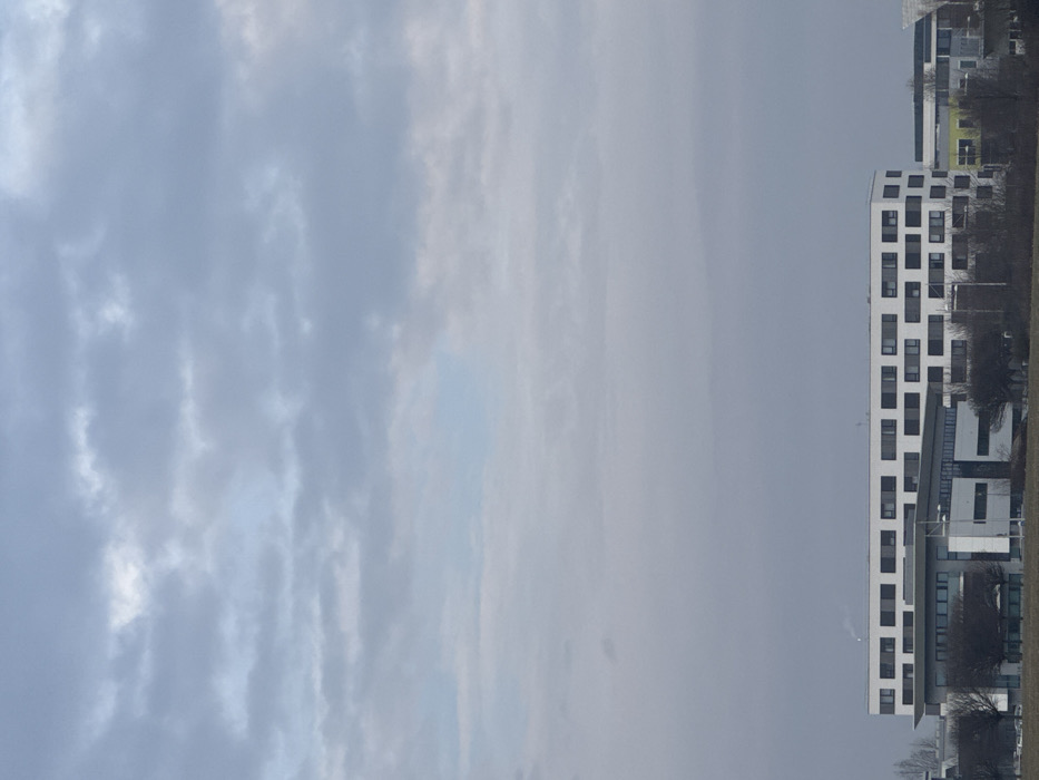 The image depicts an overcast daytime scene in Oberhausbergen, France, showcasing a modern architectural landscape. The upper two-thirds of the frame are dominated by a cloudy sky, characterized by layers of light grey and pale blue stratocumulus clouds, creating diffused illumination. In the lower third of the image, the foreground consists of a dark brown, possibly uncultivated or dry grassy field, sparsely dotted with leafless deciduous trees and low-lying shrubs. Beyond this field, a complex of contemporary buildings is visible. The most prominent structure is a multi-story building with a white facade and numerous dark, rectangular windows uniformly arranged across its surfaces, suggesting a modular or office-style design. This building exhibits a slight curvature or angularity in its structure. To its left, a plume of light-colored smoke or steam ascends vertically into the sky, originating from behind the building line. Adjacent to and partially in front of this main white building are other modern structures with predominantly grey and white facades, featuring straight lines and functional designs. Towards the far right, a distinct building with a section painted bright yellow or lime green is visible, contrasting with the more muted tones of the other edifices. No individuals, vehicles, or explicit actions are discernible within the frame. The overall environment suggests a suburban industrial park or a modern campus setting.