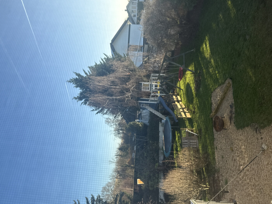 A residential backyard in Swisttal, Germany, is depicted under a clear blue sky with a visible contrail