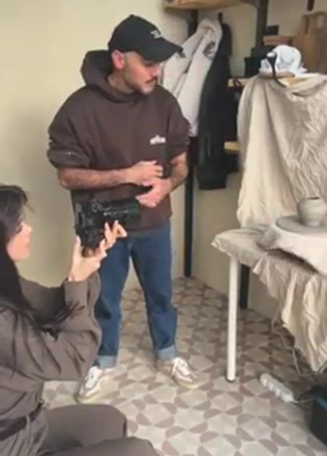 The scene shows a woman taking pictures of a man. The woman is kneeling and holding a camera, aiming it at the man. She has long, dark hair and is wearing a brown outfit. The man stands next to a small table that has a piece of pottery on top of it. He's wearing a brown hoodie, jeans, a black baseball cap, and sneakers. He has a mustache and appears to be giving directions, gesturing towards the pottery. In the background is a shelf with various items on it. The room has a patterned floor and off-white walls.