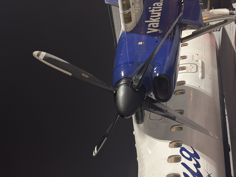 A Yakutia airlines airplane is shown from a low angle. The nose of the plane is painted bright blue with the airline name in white, and the propeller is black. The plane body is white with gold-trimmed windows. The photo appears to be taken at night.