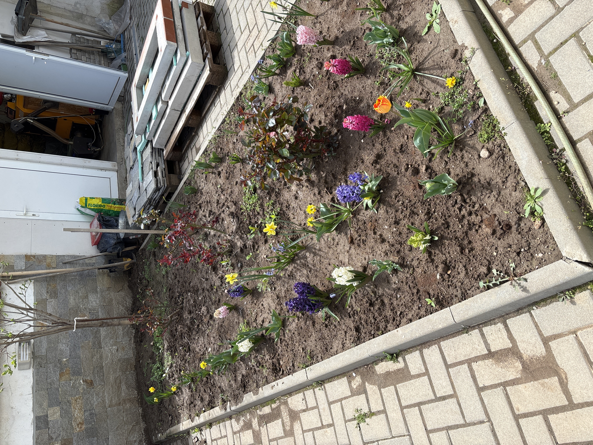 The image depicts a rectangular flowerbed in an outdoor setting, likely a garden. The flowerbed is bordered by light gray concrete pavers. The soil within the bed is dark brown and contains various flowering plants in different stages of bloom. These include hyacinths (purple, pink, white), daffodils (yellow), and tulips (orange). A small tree is visible along the left side of the frame, near a wall constructed of stone. An open door is partially visible in the upper left corner of the image along with building materials such as wooden pallets. In the background, garden tools such as shovels are leaning against the building. A bag of "Florido" soil can be seen next to the open door. The location is Perushtitsa, Bulgaria.