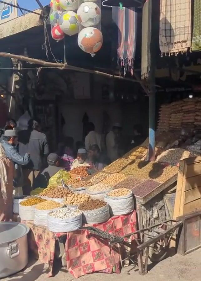 The video captures a bustling marketplace scene. A vendor's stall displays an assortment of nuts and seeds in large, round containers arranged on a table covered with a checkered cloth. Behind the table, several people, mostly men, are gathered around, possibly making purchases or engaging in conversation. Soccer balls hang above the stall, suspended from the roof, along with scarves and cloths. A large metal pot sits beside the table, while a small trolley is tucked away to the side. People walk by the stall, including a young boy who walks in front of the camera. In the background, there are signs of other shops and activity. The scene is lit by bright sunlight, and the atmosphere is lively.