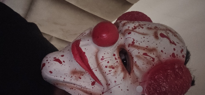 - "A close-up, angled shot focuses on a white clown mask splattered with red, resembling blood" by FM-TW7s93, licensed under CC BY 4.0