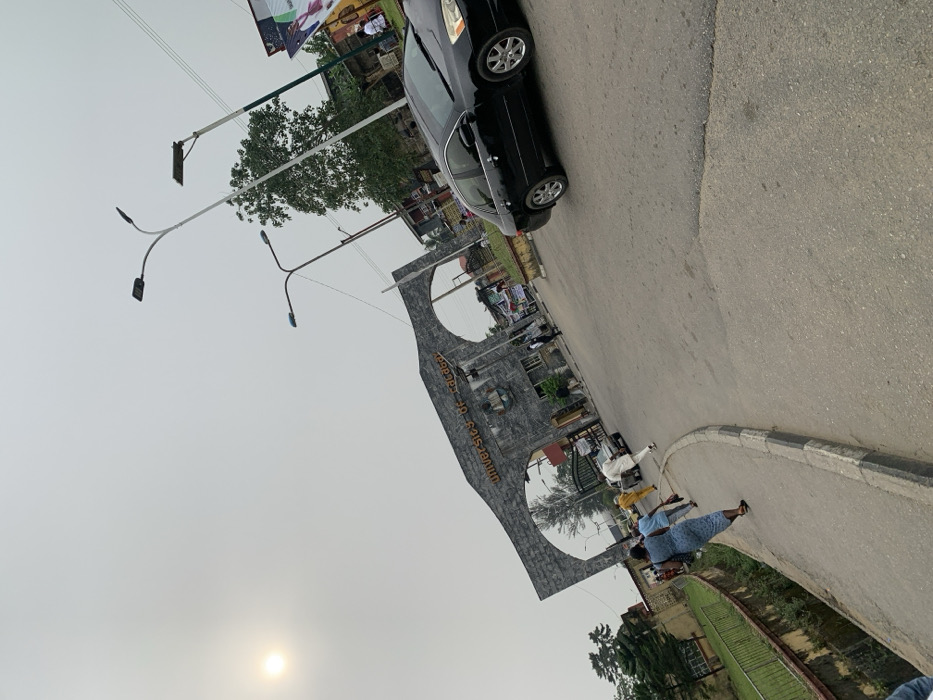 A tilted shot reveals the "UNIVERSITY OF IBADAN" gate, constructed of stone. Pedestrians stand near the gate. A black car is positioned on the road. Street lamps line the roadside. A portion of a green area is visible at the bottom. The sky is overcast, and the sun is a hazy, bright spot on the lower left.
