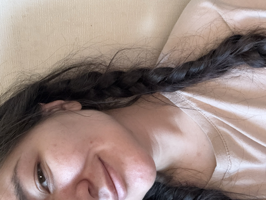 A close-up, indoor portrait depicts the right side of a female's face and upper torso, cropped above the forehead and mid-chest. The subject has fair skin, a visible dark right eyebrow, and a dark brown right eye looking slightly towards the viewer's left. A subtle smile is present, indicated by the curve of the mouth. Dark brown hair is styled in two visible braids, one resting over the right shoulder, with loose strands around the face and hair. She is wearing a plain, light beige crew-neck t-shirt. The background is a uniform, light-colored wall with a subtle textured finish. No specific architectural or environmental details are present to identify a precise location within the city of Kurovskoye, Russia.