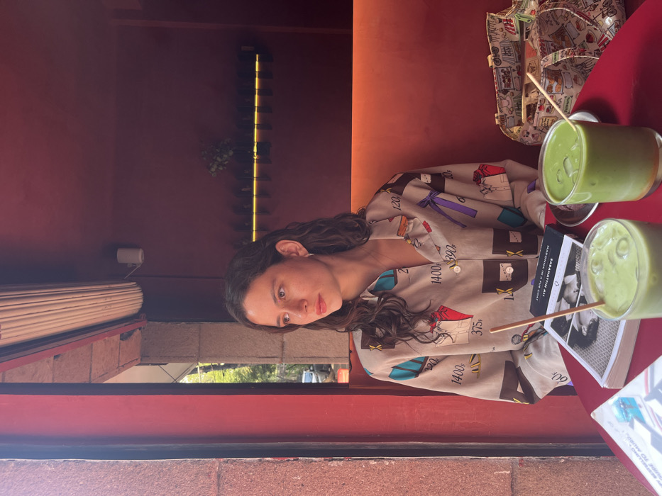 A young woman with curly hair sits at a red table indoors, with two green drinks and books nearby