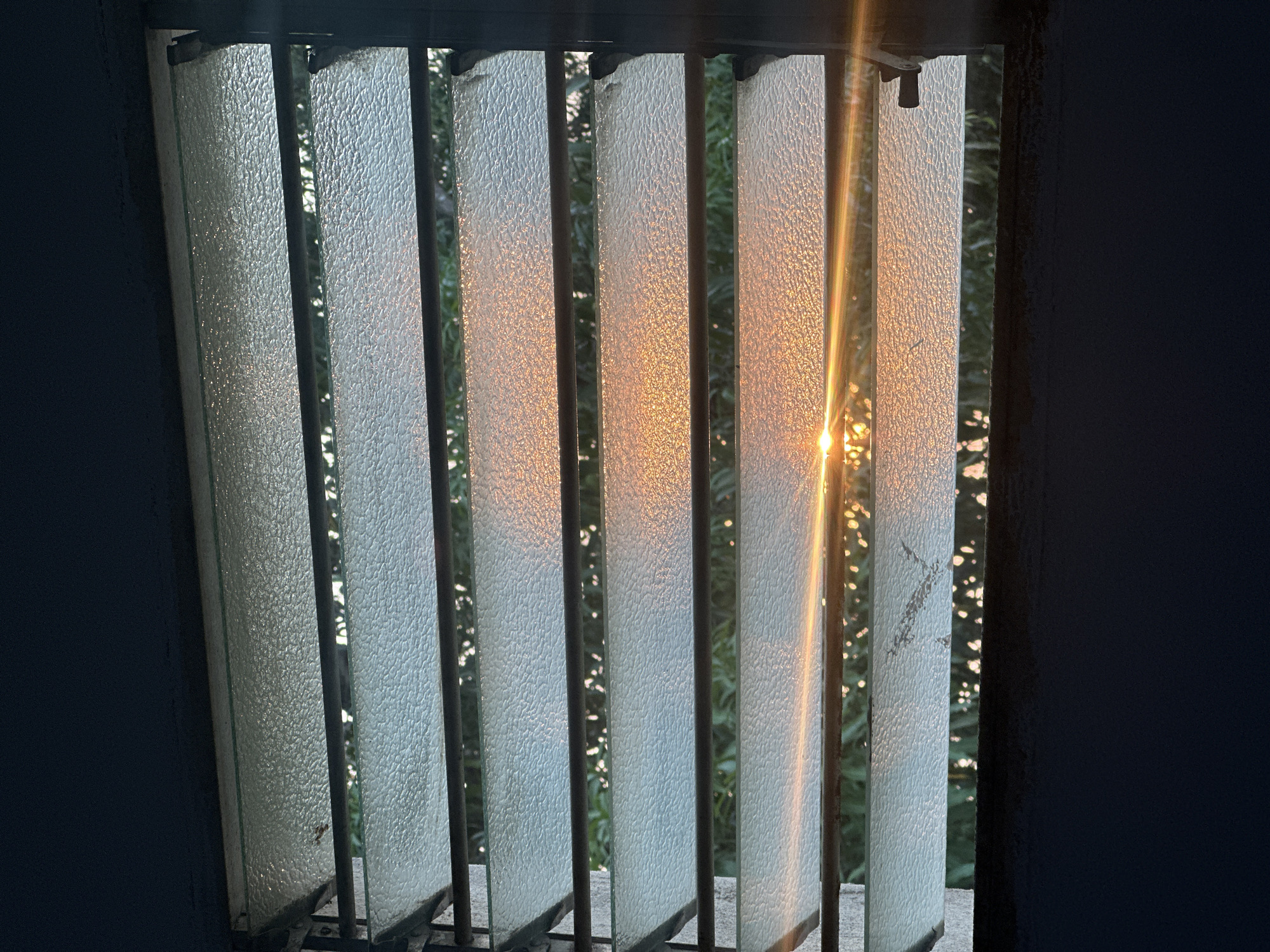 A louvered window, positioned in Tinaquillo, Venezuela, is viewed from an interior perspective. The window consists of seven horizontal textured glass panes, held within dark metal frames. Bright, intense sunlight, consistent with a low sun angle (sunrise or sunset), is directly visible near the lower-left portion of the window, casting a prominent orange-yellow lens flare and illuminating the lower panes. The textured glass diffuses this light, creating a warm glow across the lower two-thirds of the window. Through the gaps between the louvers and faintly through the textured glass, dense green foliage, likely trees or bushes, is visible, with sunlight dappling through its leaves. The immediate interior surrounding the window is dark, contrasting sharply with the illuminated exterior. A window adjustment knob is visible on the right vertical frame near the bottom. No individuals are present.