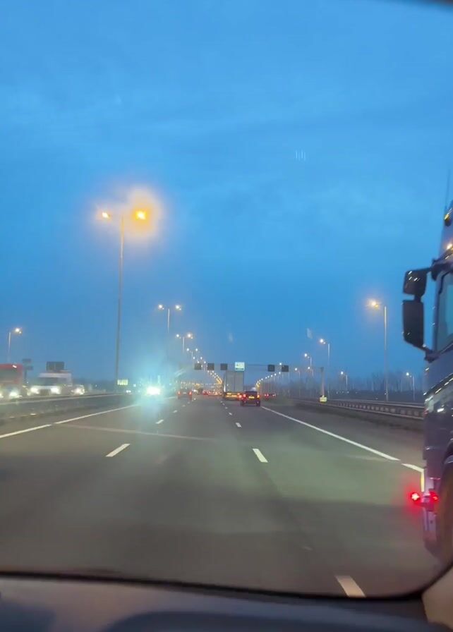 first-person view from inside a car driving on a highway at dusk or dawn. The sky is a muted blue, and streetlights line the road. There are other vehicles on the highway, including a large truck visible on the right. The scene then transitions to a close-up view of a laptop screen, displaying coding and documents, possibly related to software development. The screen's content includes code, various applications, and documents written in a language that appears to be Bulgarian. The video then returns to the highway view, showing the road ahead through the windshield with the laptop screen visible in the foreground. The car continues to move forward.