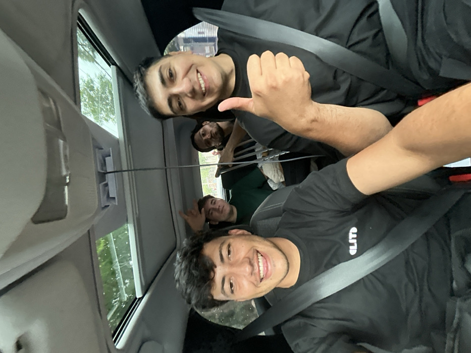 The image depicts four males inside a passenger vehicle, posing for a photograph