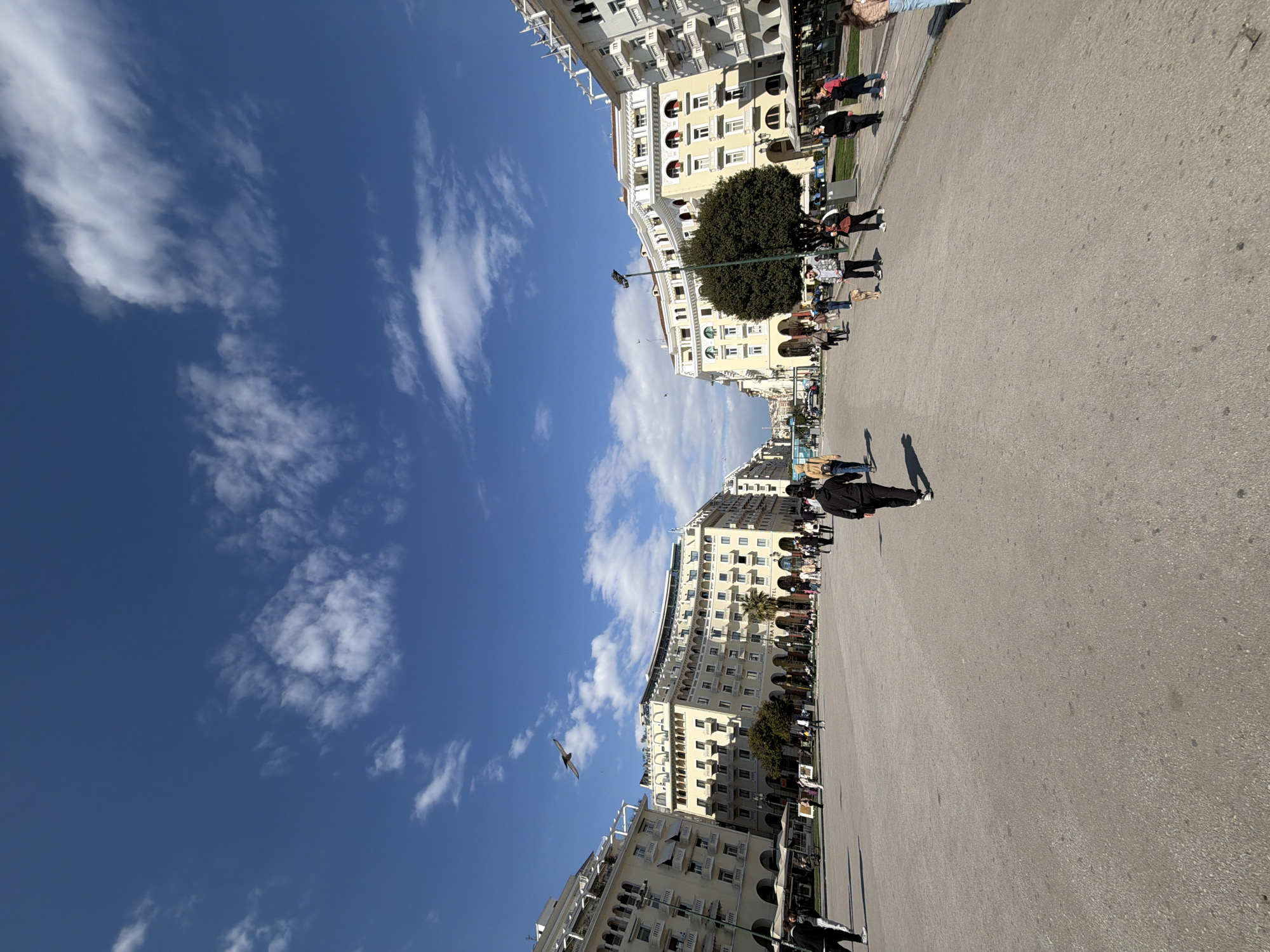 This image captures Aristotelous Square in Thessaloniki, Greece, on a clear, sunny day. The scene depicts a wide, grey paved urban plaza framed by multi-story neo-classical buildings with cream and white facades on both the left and right sides. The building on the left, slightly set back, is identifiable as the "ELECTRA PALACE HOTEL," featuring numerous balconies and arched ground-floor openings. The building on the right has similar architectural details, including red accents on some windows and multiple balconies. The sky above is deep blue with scattered white cumulus clouds. A single bird is observed in flight in the upper left quadrant of the sky. In the foreground, the expansive square is largely open. Approximately one-third of the image width from the right, a person in a black hoodie and black pants is walking away from the camera. Shadows cast on the pavement indicate strong sunlight. In the midground, various pedestrians are dispersed across the square and along its edges. A group of individuals is gathered near a large, dark green, manicured tree positioned on the right side of the square, close to the building facade. Among this group, one person is seen walking a light-brown dog on a leash. Other pedestrians are visible walking in various directions, interacting minimally with each other, primarily traversing the public space. Some individuals are seated or standing at outdoor cafe areas along the base of the buildings, under awnings. In the far background, beyond the main buildings, distant cityscape features, possibly on a hillside, are faintly visible under a lighter sky. Streetlights and decorative elements are present along the square's edges.