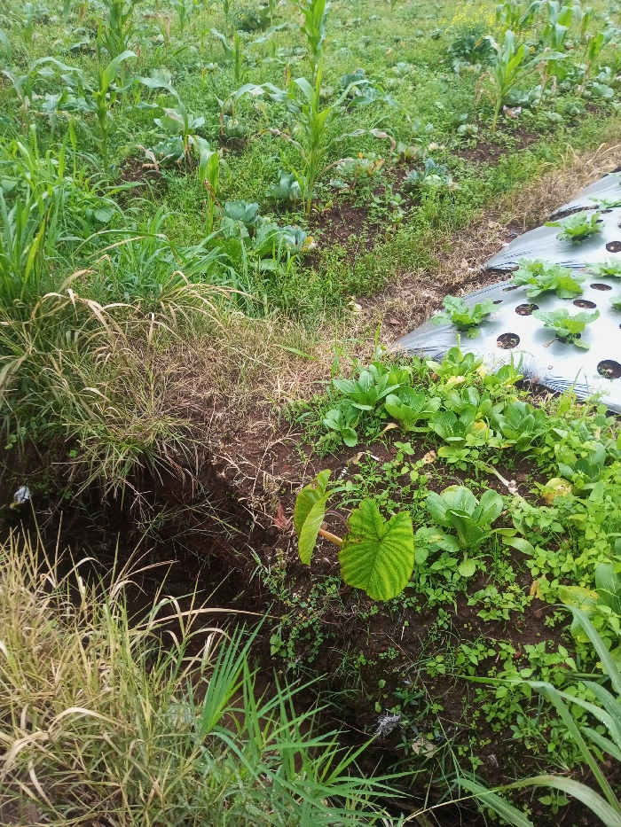 The image displays an agricultural field in Ingavali, India, under natural daylight conditions. The scene is dominated by various cultivated plants and ground features. In the background and mid-background, young corn (maize) stalks are visible, interspersed with green cabbage plants growing in dark soil. To the mid-right, a section of dark grey plastic mulch film covers the ground, featuring evenly spaced circular cutouts from which numerous young, green leafy plants, resembling lettuce or bok choy, are growing. The foreground, predominantly on the left side, features a narrow, unlined earth ditch or trench, partially obscured by drier, lighter-colored grasses and greener foliage. To the right of the ditch in the immediate foreground, a single large-leafed plant with prominent green veins is present, surrounded by smaller green plants and exposed dark soil. No individuals, animals, or artificial structures other than the mulch film are visible within the frame.