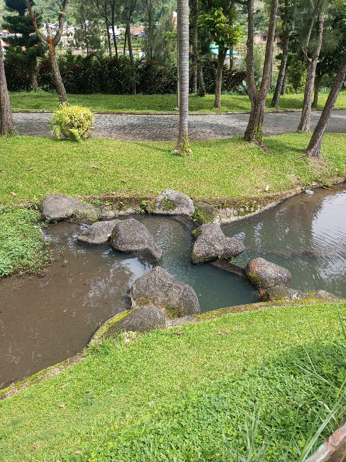 A stream with several large rocks forms a natural barrier. One side appears muddy and still, while the other has flowing water. Lush green grass surrounds the stream. The background reveals trees and a paved path. A cluster of green plants with yellow flowers sits atop the grass near the path. The scene conveys a serene park setting.