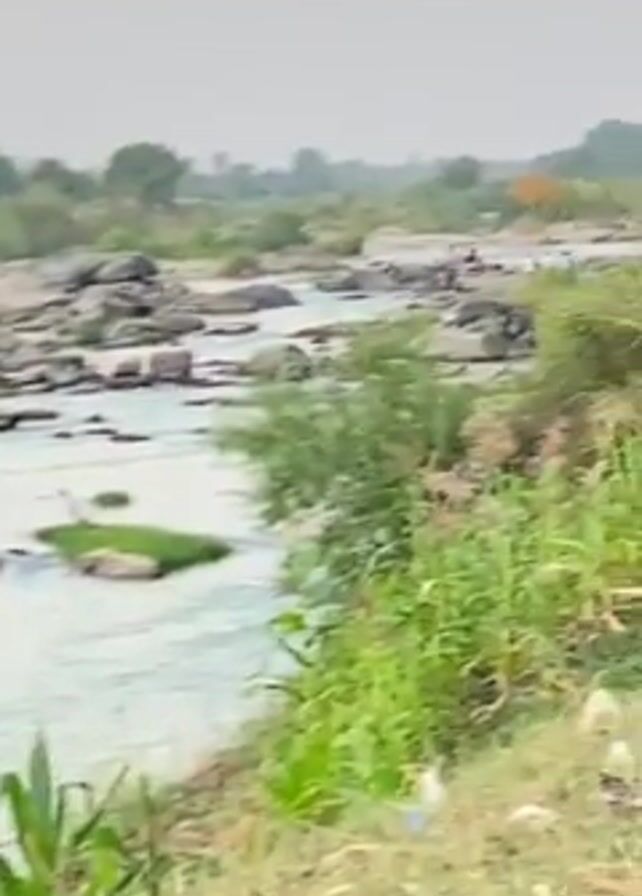 river landscape. The river flows amidst rocks and vegetation. There's visible pollution including trash on the river bank and in some areas of the river. Some people are seen in the distance on a rocky area of the river. A couple of trees can be seen in the background. The sky is overcast.