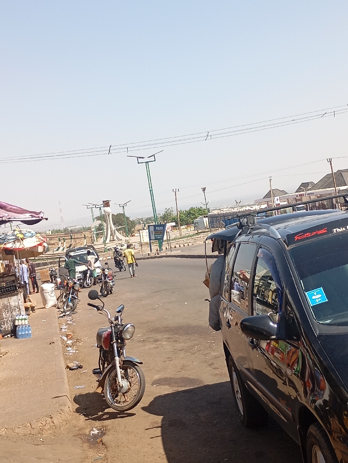 This image depicts a daytime scene at the Gombe Emir's Palace Roundabout in Gombe, Nigeria