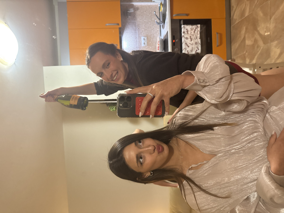Two females are depicted indoors within what appears to be a combined kitchen and living area, likely in a private residence in Donji Pobori, Montenegro. The primary subject in the foreground, a female with long dark hair, is positioned centrally, taking a mirror selfie using a black smartphone with a clear case and a red "Pop It" style grip. She wears a shimmering, light-colored long-sleeved blouse with pleated sleeves, small hoop earrings, and a delicate necklace, her lips pursed in a pout. Her left hand, adorned with a ring on the ring finger and red nail polish, holds the phone. Reflected behind her, partially obscured, is a second female with dark hair, smiling and holding a green glass bottle with an orange label (possibly sparkling wine or champagne) aloft with her right hand. She wears a dark long-sleeved top and a small stud earring. The background reveals a kitchen area with bright orange upper and lower cabinets, a light-colored tiled backsplash, a stainless steel sink, and an integrated oven below a stovetop. A white light fixture is visible on the ceiling. To the left, a portion of a light-colored sofa suggests an adjacent living space.