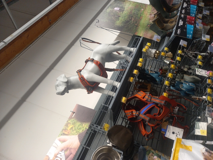 The scene depicts an interior view of a retail establishment located in Vendin-le-Vieil, France. A light grey, full-body dog mannequin stands on an elevated black metal display shelf, positioned centrally. The mannequin is adorned with an orange and black multi-strap dog harness. Below the mannequin, multiple tiers of black metal shelving units are stocked with pet and outdoor equipment. Visible items include metallic pet bowls on the left, various orange and blue dog harnesses, leashes, collars, and small pet accessories such as bells and tags. To the right, on a lower shelf, a series of brown and green boots are displayed. The background consists of light-colored walls featuring large promotional posters: one on the left shows a human hand, and another on the right illustrates a person in a green, forested outdoor setting. Numerous product labels and yellow price tags are affixed to the shelves. Overhead, industrial lighting fixtures and a wooden support beam are present.
