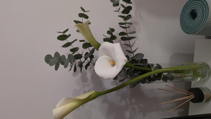 This scene is located in Budva, Montenegro. An indoor still life composition features a clear, cylindrical glass vase filled with water, containing a floral arrangement. The arrangement consists of three white calla lilies (Zantedeschia aethiopica) and multiple branches of eucalyptus foliage. Two calla lilies are fully open, displaying prominent yellow spadices, while the third is a partially open bloom. The eucalyptus branches exhibit numerous glaucous, ovate leaves. The vase rests on a flat, white surface. To the left of the vase, a small, dark-lidded glass reed diffuser bottle containing light-colored reeds is present. To the right, a rolled-up light teal or mint green exercise mat is positioned. The background is a plain, light-colored wall, with shadows cast from the floral arrangement. No individuals are depicted.