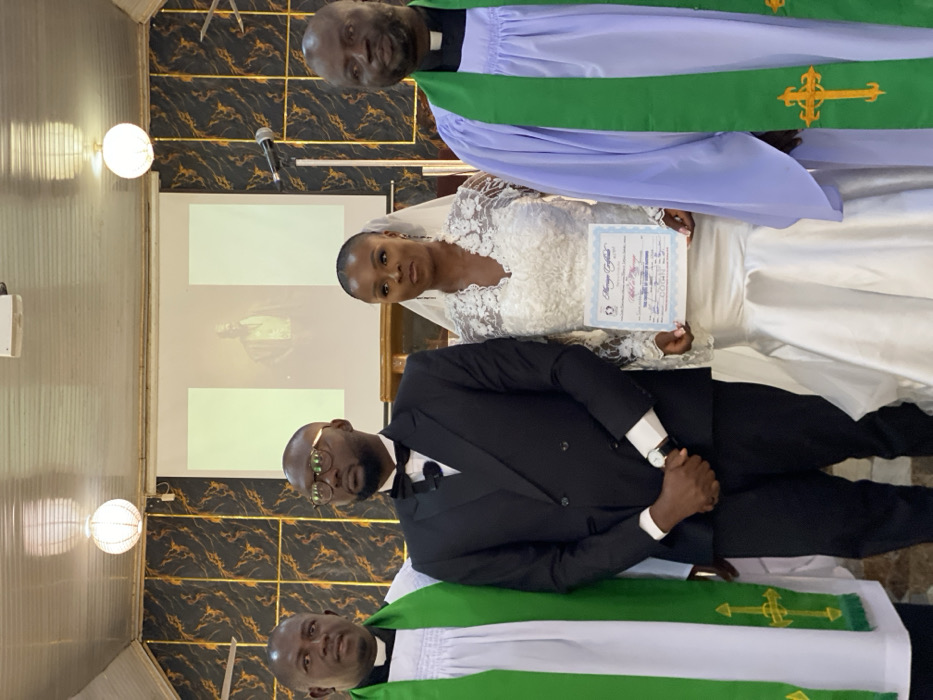 Four individuals are formally posed for a portrait during a wedding ceremony in Jos, Nigeria