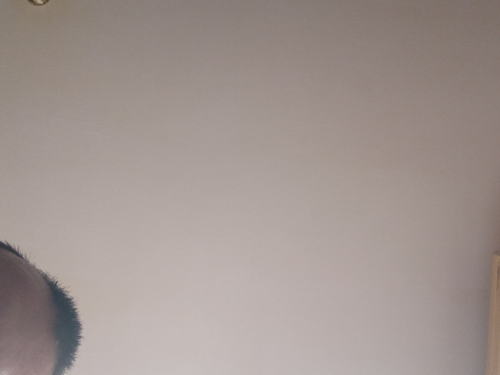 The scene is an interior view, located in the city of Provadia, Bulgaria. The upper left approximately 90% of the frame displays a uniform light beige-grey wall or ceiling surface, exhibiting minimal textural variations. In the lower right quadrant, the uppermost portion of a human head is visible, characterized by a light-toned forehead and short, dark hair at the hairline. No facial features are discernible. Along the top edge, slightly right of center, a narrow strip of light-colored wood is partially visible, consistent with a structural beam or trim. A small, indistinct metallic object is present near the bottom left corner of the frame. No discernible actions or interactions are occurring.