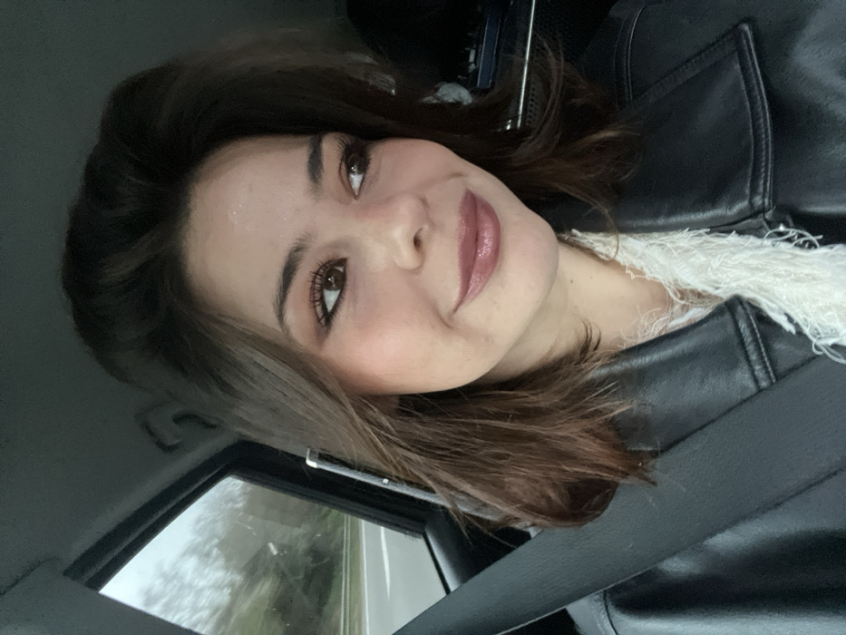 The scene is set inside a vehicle, located in Marcq-en-Barœul, France. A young adult female is positioned in what appears to be the front passenger seat. She has medium-length, voluminous dark brown hair. Her face exhibits a light-to-medium complexion with visible eye makeup, blush, and glossy mauve-pink lipstick. She displays a subtle smile, with her gaze directed towards the upper-right portion of the frame, away from the camera. The subject is dressed in a black jacket, consistent with leather or faux leather material, worn over a white top featuring a distinctively textured, possibly fringed, neckline. A black seatbelt is securely fastened across her left shoulder and chest. Through the vehicle's window on the left, an exterior environment is visible, characterized by an overcast sky, bare trees, and a road section marked with a white line, indicating travel during what appears to be a cool or temperate day. The vehicle's interior is generally dim, with soft, diffused light illuminating the subject's face from the left.