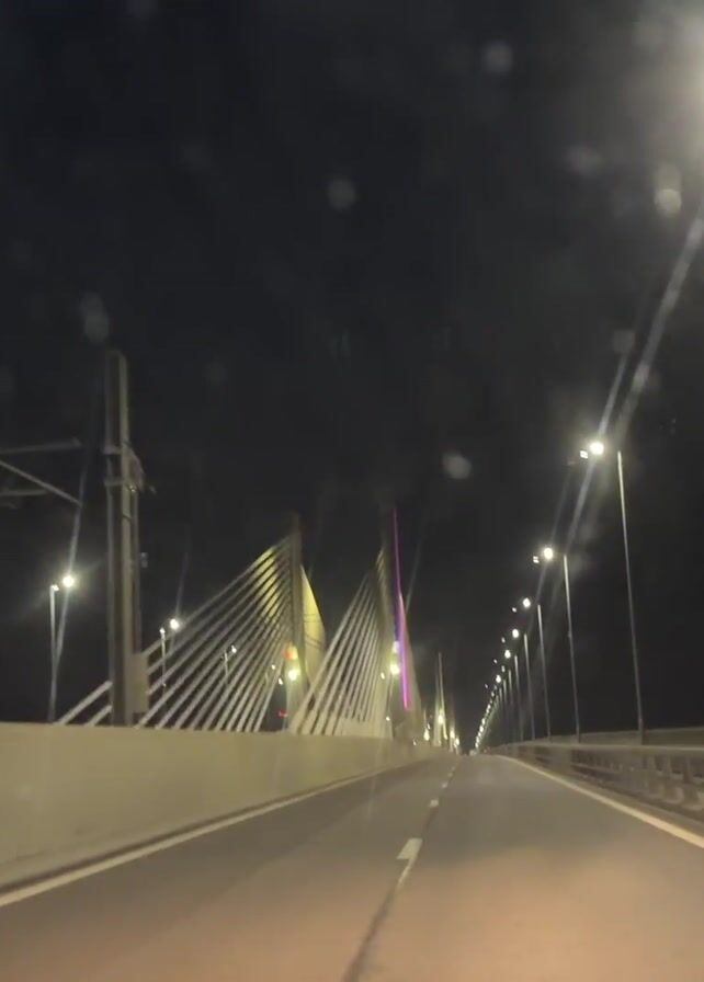 perspective from inside a car driving at night on a bridge, with the lights on the bridge illuminating the structure and the road. The bridge is supported by a large pylon with many supporting cables. The pylon is lit with colored lights. Street lights line the bridge on either side of the road. There is no other traffic visible. The windshield of the car has some water droplets on it.