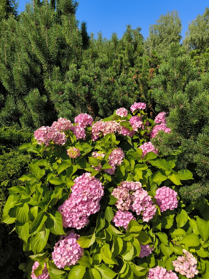 The image displays a detailed view of lush flora within the city of Novi Petrivtsi, Ukraine. The foreground is dominated by a thriving hydrangea bush, exhibiting numerous large, spherical clusters of vibrant pink blossoms. Its foliage is a deep green, with individual leaves clearly defined. Directly behind the hydrangea, a dense barrier of dark green coniferous trees, specifically pine or similar needle-leaved evergreens, occupies the midground. The upper right portion of the background reveals lighter green deciduous tree foliage. The sky above is a uniform, clear blue, indicating bright daylight conditions. No human subjects, animals, or man-made structures are visible within the frame. The scene presents a well-maintained natural or landscaped environment.