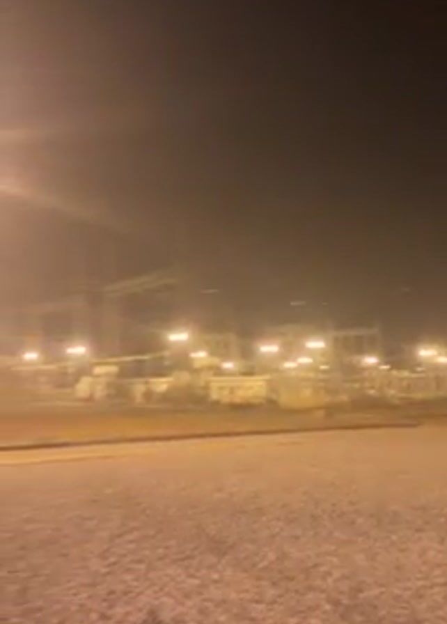 The video depicts an electrical substation at night. The camera pans slightly left across a gravel surface. Bright lights illuminate the substation's structures and power lines. The atmosphere appears hazy or foggy. There are no people or other objects visible in the foreground.
