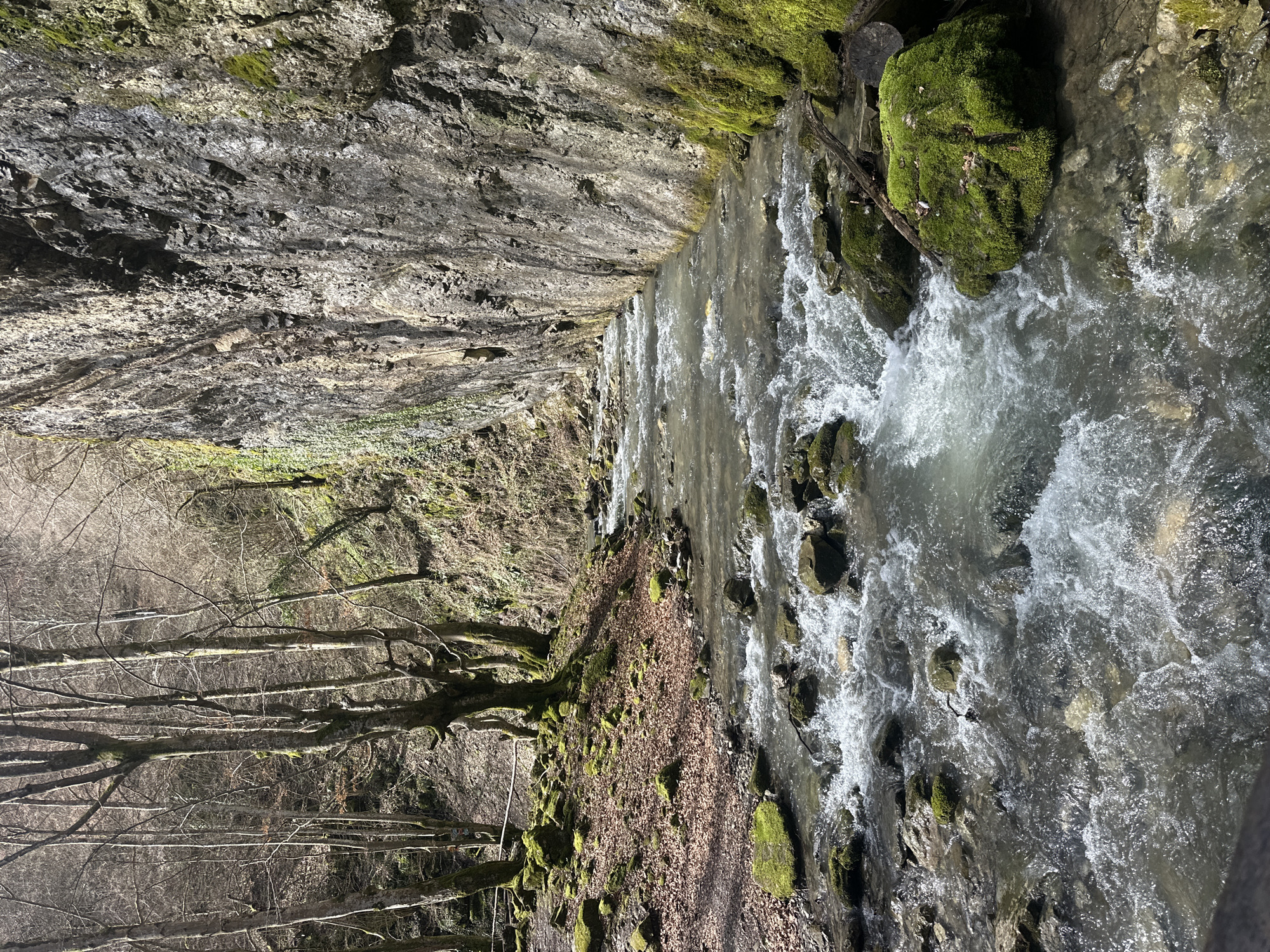 The image depicts a rocky, fast-flowing river within a gorge near Teteven, Bulgaria. The water is churning and white, indicating rapid movement over stones and rocks. The river's edges feature rocks covered in green moss. On one side, a tall, steep rock face rises, also partly covered in moss. On the opposite side of the river, a lower, sloping bank is covered with brown leaves and some moss. Beyond the bank, bare trees without leaves are visible, suggesting it is either late autumn or winter. There are no people visible in the image. The light indicates it is daytime.