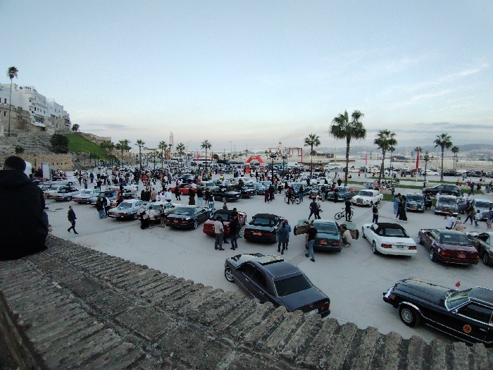 The image depicts an outdoor event featuring numerous classic automobiles and a large crowd of people, situated in a paved plaza in Tangier, Morocco