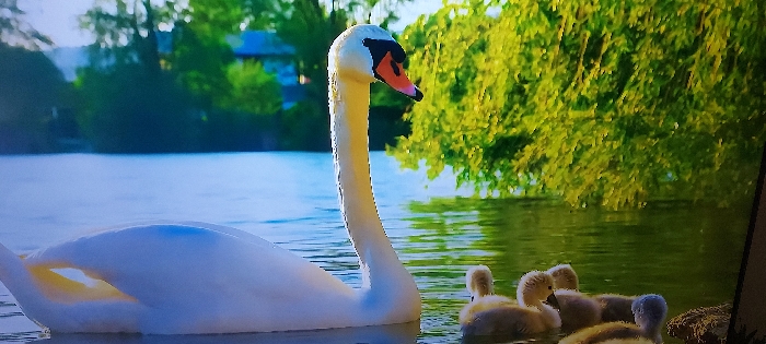 - "An adult white mute swan (Cygnus olor) and a group of approximately six young cygnets are situated on a body of water, likely a lake or pond, within Razgrad, Bulgaria" by FM-KpKSC3, licensed under CC BY 4.0