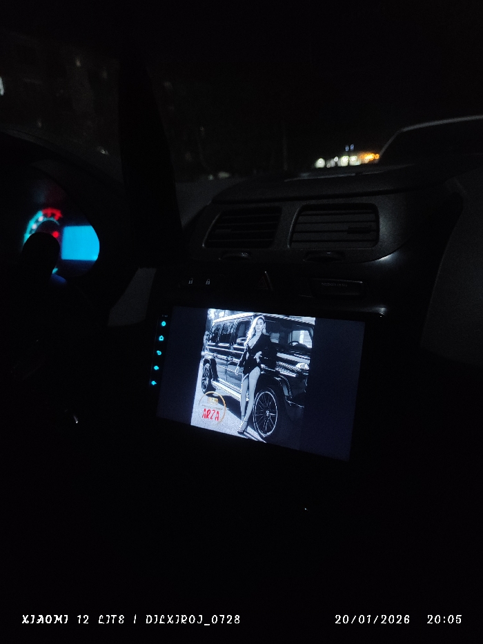 Inside a dark car interior, a dashboard screen displays a black and white image. The image shows a woman wearing a blazer with a car, presumably a G-Wagon. The name “ARZA” is on the bottom left corner of the screen. A steering wheel with an illuminated dashboard is visible on the left side. The date and time, "20/01/2026 20:05", are displayed in the bottom right corner.