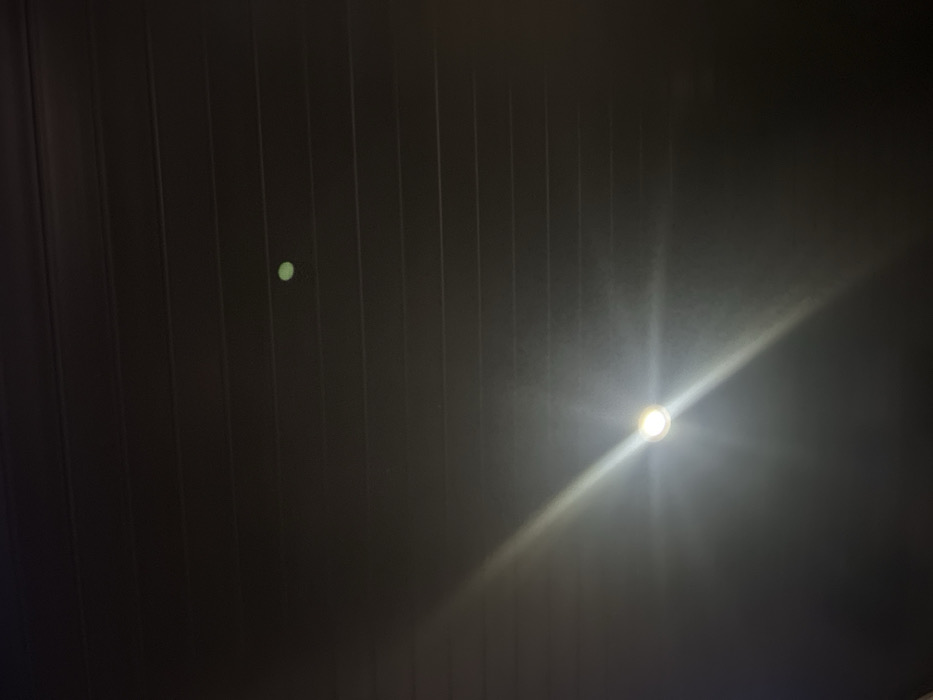 An indoor scene within Jos, Nigeria, features a dark, paneled ceiling with horizontal lines. A bright, circular white light fixture is active in the lower-left quadrant, emitting a distinct starburst flare. In the upper-right quadrant, a small, circular, light green object is present, possibly an indicator light or sensor. No individuals, additional objects, or discernible actions or interactions are visible.