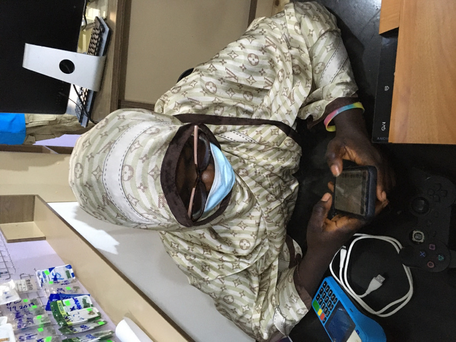 The image displays an indoor commercial setting, situated in Jos, Nigeria. A single individual, with a dark complexion, is seated at a dark-colored counter or desk, viewed from an elevated perspective. The person wears a light-colored garment or head covering patterned with repeating "LV" monograms and edged in dark brown. Dark-framed eyeglasses with pink accents and a light blue surgical mask obscure most of the face, leaving only the forehead and eyes visible. Both hands are holding a dark-colored smartphone, with fingers positioned as if interacting with the screen. A multi-colored wristband is visible on the individual's left wrist. On the counter to the left of the person's hands, a light blue point-of-sale (POS) terminal with a multi-colored keypad is present alongside a coiled white USB cable. Below the hands, a black gaming controller, consistent with a PlayStation design, rests on the surface. To the right, a dark object with a wooden face and a metallic strip bearing partial text ("ANC") is also on the desk. The background on the left features a white wall with a display rack showcasing multiple small, clear plastic pouches containing various items, some marked with handwritten labels such as "Honor," "19," and "25." On the right, a silver iMac desktop computer with a black screen and keyboard is visible on a higher surface. In the far background, a second, out-of-focus individual wearing a blue shirt and beige pants is partially visible, appearing to be standing or moving in a doorway. The scene is illuminated by indoor lighting.
