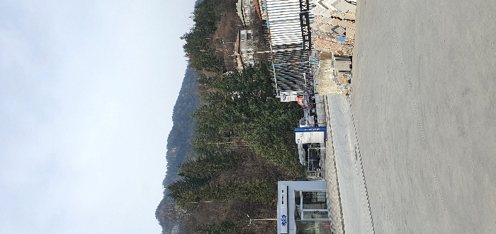 This image depicts a commercial area situated in Smolyan, Bulgaria, at the base of a forested mountain range under an overcast sky