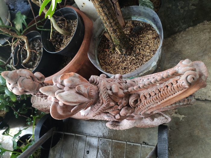 An intricately carved, reddish-brown terracotta statue, depicting a mythical creature resembling a dragon or naga with ornate headwear and scales, lies partially visible on a light gray concrete surface in Nieste, Germany