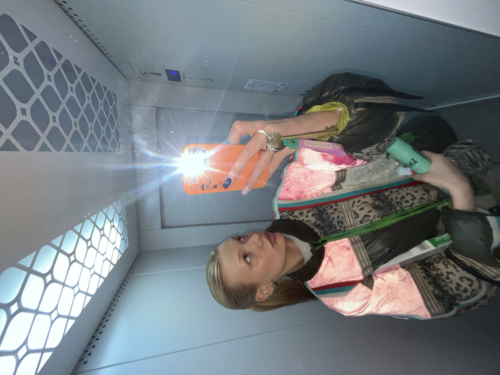 A young woman is taking a selfie inside an elevator in Chaikovsky, Russia. She is wearing a pink and black jacket with leopard print. She holds an orange cell phone with a bright light on in her right hand. Her nails are painted blue and pink. She is holding a green cylindrical object in her left hand. The elevator interior is white with a decorative grill on one wall. There is a control panel visible. There is condensation on the walls.