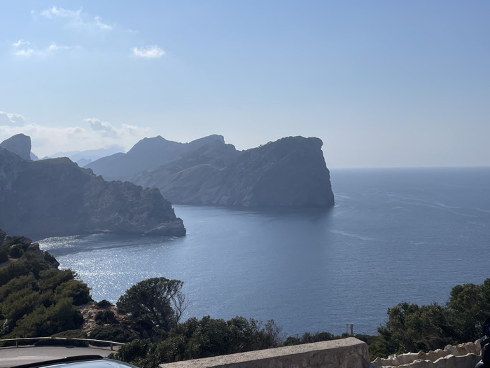 The image displays a panoramic coastal landscape, likely viewed from the Formentor Peninsula in the municipality of Pollença, Spain. A vast expanse of deep blue sea occupies the right half and lower-middle ground of the frame, extending to a hazy horizon under a clear, pale blue sky with minimal scattered clouds in the upper left. Sunlight reflects brightly on the water within a cove or bay on the mid-left. A series of dark, rugged mountains and cliffs rise sharply from the sea, receding into the distance on the left, exhibiting atmospheric perspective. A prominent, sheer rock face or headland juts into the sea from the mid-right. The foreground features a low, rough-hewn stone wall running horizontally across the bottom. Partially visible below the wall on the left is the top of a light-colored vehicle, likely a car, suggesting presence on a road or viewpoint. Scattered green scrub and trees cling to the rocky terrain in the lower left and bottom right sections of the image. No individuals or active subjects are present.