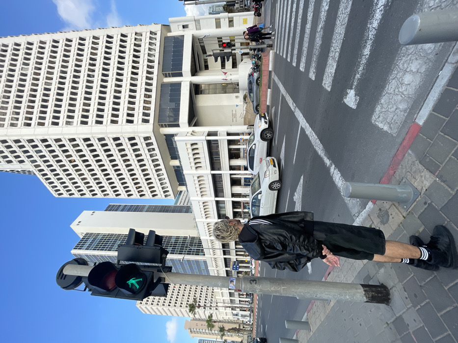 An urban street scene in Tel Aviv, Israel, specifically depicting the intersection near the Migdalor Building (Menora Mivtachim Tower) on Menachem Begin Road. In the foreground, a person with short, bleached blonde hair stands on a grey tiled sidewalk, facing away from the camera towards the street and buildings. This individual wears a black hooded jacket with white stripes on the sleeves, black shorts, black socks with white stripes, and black athletic shoes. Their hands are clasped behind their back. To their immediate left, a grey pole supports a pedestrian traffic light displaying a green 'walk' signal (a white walking figure) and an adjacent vehicle traffic light showing a red circular light. A crosswalk with white zebra stripes is marked on the asphalt road directly in front of the foreground subject. Three vehicles are stopped in the lane closest to the viewer: a white sedan with a yellow sticker, a white SUV, and a grey SUV. On the far side of the road, two pedestrians are visible walking rightward on the sidewalk. The dominant structure in the background is the Migdalor Building, a tall, white high-rise with numerous small, rectangular windows arranged uniformly. Its lower levels feature dark glass windows and white architectural details, including vertical fluting. Other modern high-rise buildings and palm trees are visible in the distance to the left. The sky is clear blue with minimal cloud cover, indicating daytime conditions. Grey cylindrical bollards are present on the sidewalk near the crosswalk.