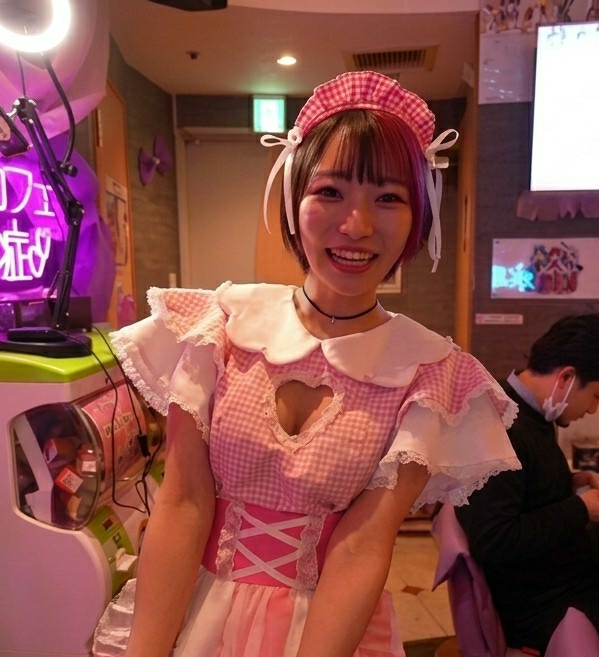 A young adult female, with short dark hair featuring a magenta streak on her left side, smiles directly at the camera. She is dressed in a pink and white gingham maid-style uniform, which includes a Peter Pan collar, a heart-shaped chest cutout with lace trim, ruffled sleeves, a pink corset-style bodice with white lacing, and a matching gingham headpiece with white ribbons. A black choker with a small silver charm is visible on her neck. She is positioned indoors in what appears to be a themed establishment, likely a maid cafe, located in Shinjuku, Japan. To her left, a bright ring light is mounted on a black stand, resting on top of a multi-colored (green, white, pink) arcade-style game or display unit. A purple neon sign with Japanese characters, possibly "カフェ" (cafe), illuminates the background on the left. Further back, a purple bow decoration is affixed to a wall. To her right, in the blurred background, a male individual is seated, wearing a dark jacket and a white face mask, looking downwards. A large screen is visible on the wall behind him. The environment is characterized by vibrant artificial lighting, including pink and purple hues.