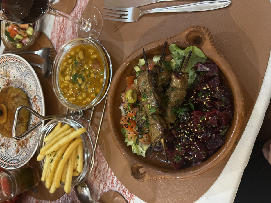 This image captures a close-up, overhead view of a meal served at a restaurant in Strasbourg, France. The scene is set on a white tablecloth, overlaid with brown placemats. The primary focus is a large, rustic terracotta dish in the foreground, containing two skewers of grilled meat (kebabs) resting on a bed of green lettuce, diced tomatoes, cucumbers, and green olives. Adjacent to the skewers within the same dish is a portion of diced beetroot salad, garnished with white sesame seeds and chopped herbs. To the upper left, elevated on a metal serving stand, is a clear glass bowl filled with golden-brown french fries, lightly sprinkled with green herbs. Directly opposite, on the upper right side of the same stand, is another clear glass bowl containing baked white beans in a rich, reddish-brown sauce, also garnished with herbs. In the background, positioned centrally, is a round, decorative plate with a patterned rim, holding a pastry or savory pie, possibly a chicken pastilla, topped with a dark olive. To its far right, a small clear glass bowl contains a fresh side salad of diced cucumbers, tomatoes, and red onion. Beverages include a stemmed wine glass filled with red wine, situated in the upper right quadrant. To the upper left, a small patterned glass holds a greenish liquid, possibly mint tea or a sauce. Silverware, including forks and a knife, are visible to the right of the main dish, and a spoon is partially visible on the left. No individuals are present or engaged in any actions within the frame; the scene is a static presentation of the food.