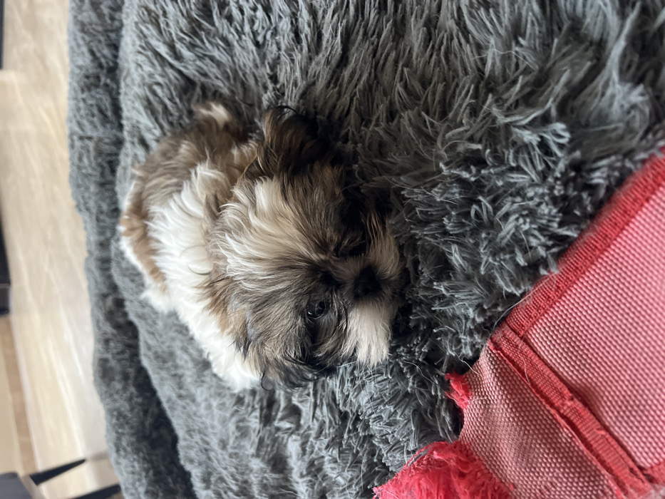 A small, fluffy Shih Tzu puppy is nestled on a gray, shaggy blanket. Its fur is a mix of white, brown, and black, with a pronounced dark muzzle. The puppy appears to be resting or sleeping, blending somewhat into the textured blanket. To the right, a red and white fabric toy is partially visible, adding a pop of color. The image is taken from a high angle, providing a close-up view of the dog and its immediate surroundings.