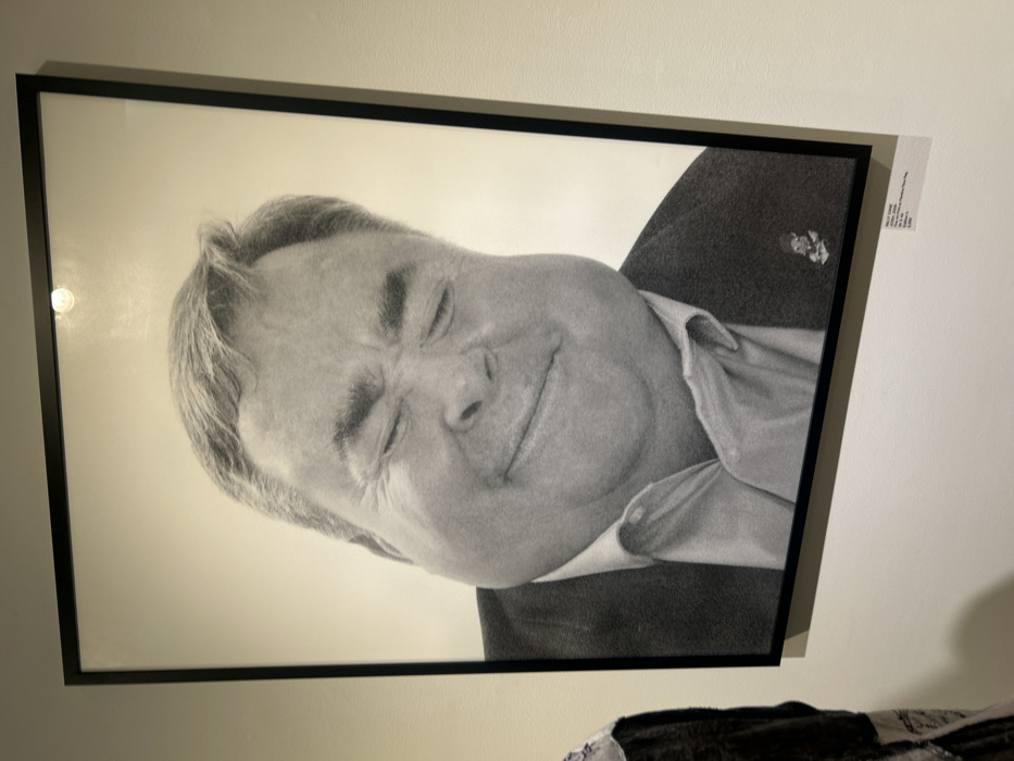 A framed, black and white portrait hangs slightly askew on a light-colored wall. The portrait depicts a man with closed eyes and a slight smile, wearing a collared shirt and a dark blazer. The artwork is presented in a black frame. A small white tag is affixed to the wall next to the frame. A portion of a patterned, dark fabric is visible in the lower part of the image.