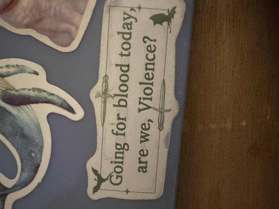 A sticker is visible with a beige border. Inside the border is a text that reads, "Going for blood today, are we, Violence?". The sticker is embellished with small images; a dagger on the left, a dagger on the right, and a bat at the top right corner. The background is a pale blue. In the upper left corner, partial images of two additional stickers are visible. One is pink, the other blue and gray. A wooden surface is seen on the right side of the sticker.