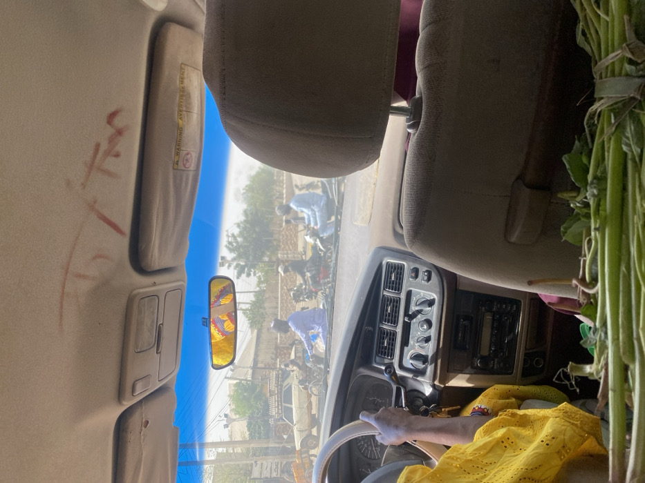 The image depicts a daytime street scene in a Nigerian city, observed from the interior of a vehicle, potentially in the vicinity of Muhammadu Dikko Stadium. The forward-facing perspective shows a dusty urban road under a clear blue sky. Inside the vehicle, a driver, whose left arm and hand are visible, operates a light-colored steering wheel. The driver wears a bright yellow garment. The dashboard, light brown in color, features air conditioning vents, control knobs, and an audio unit. A key ring with multiple keys hangs from the ignition. The rearview mirror, positioned centrally, reflects colorful patterns from inside the vehicle. Above, the light beige headliner displays reddish-brown scribbles, and a passenger-side sun visor bears a "WARNING AVERTISSEMENT" label. The top of a beige front passenger seat, including its headrest, occupies the right side of the frame. A large quantity of fresh green leafy vegetables, tied in bundles, rests in the foreground, extending across the bottom of the image. Outside the vehicle, the unpaved or dusty road is occupied by several individuals on motorcycles and scooters, appearing to be in traffic. A man in a light blue traditional long garment rides a dark motorcycle centrally. Another man in similar attire operates a light-colored scooter to the right. In the background, a light-colored sedan is visible on the left. Distant structures with light-colored walls and sparse vegetation are present. Overhead power lines traverse the scene, which is characterized by a visible atmospheric haze or dust.