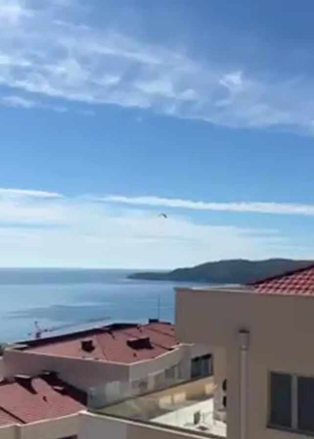 paraglider flying in a clear blue sky with scattered white clouds. Below, the viewer sees buildings with red tile roofs, a body of water, and land in the distance. The paraglider is pink and has a person suspended beneath it. The viewpoint is from an elevated position, likely a rooftop. The camera zooms in slightly as the paraglider moves further into the frame. The weather appears to be sunny.